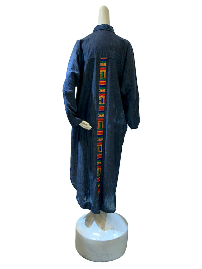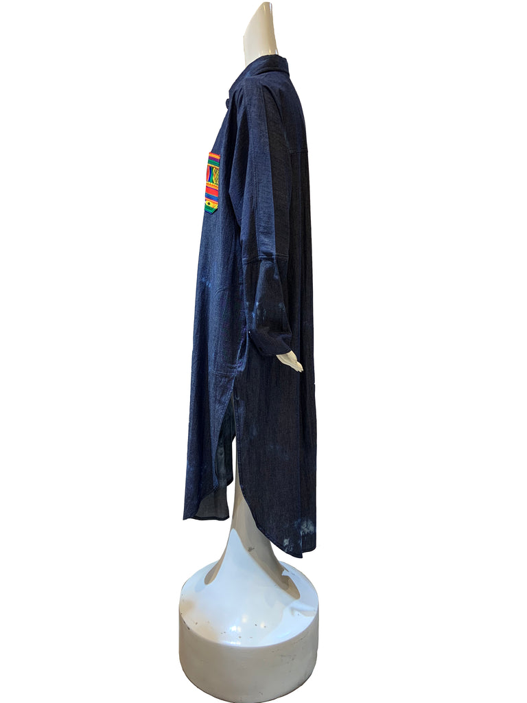 This oversized long dress style shirt has long sleeves with a pattern chest pocket, slid-in side pockets, side slit, and high-low hem