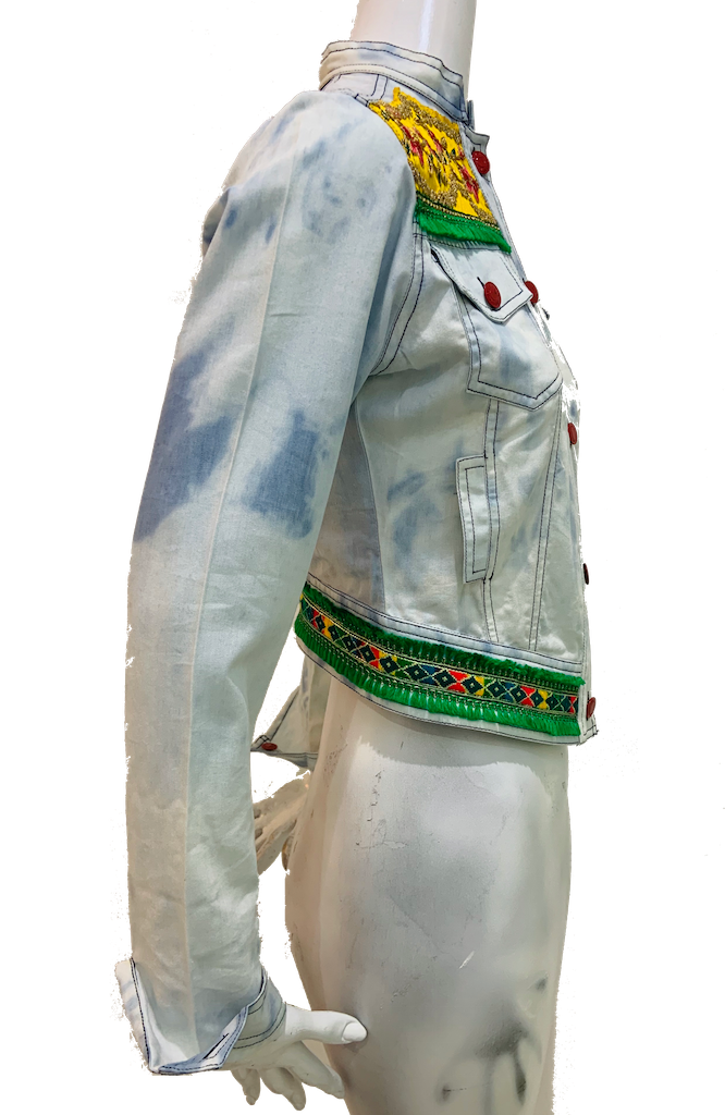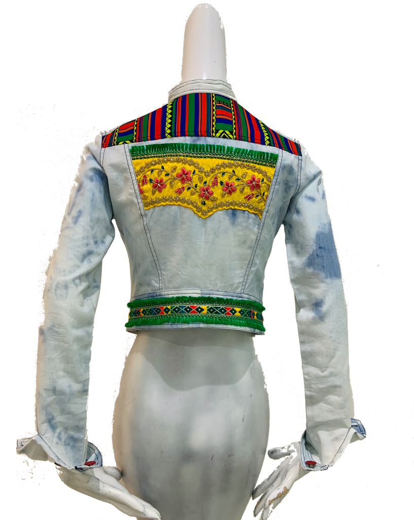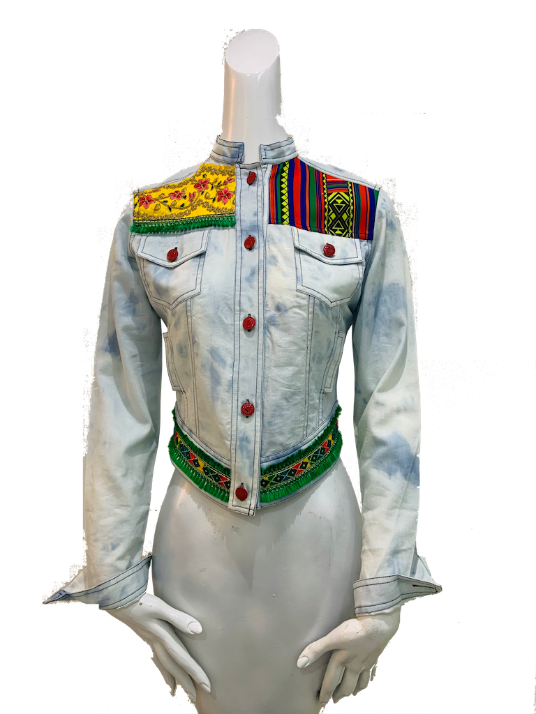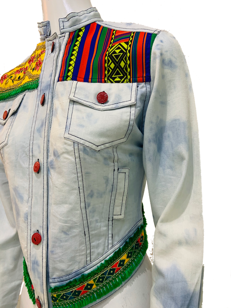 Finchitua Denim Jacket collection is one-off tailored with a luxury finish, Funky sophisticated off duty staples that speakers to the Brands tribal influences streetwear aesthetic. this blue cotton High to low hem denim jacket featuring long sleeves, Chinese collar style, two chest pockets, Multi fabrics, and a front button placket.