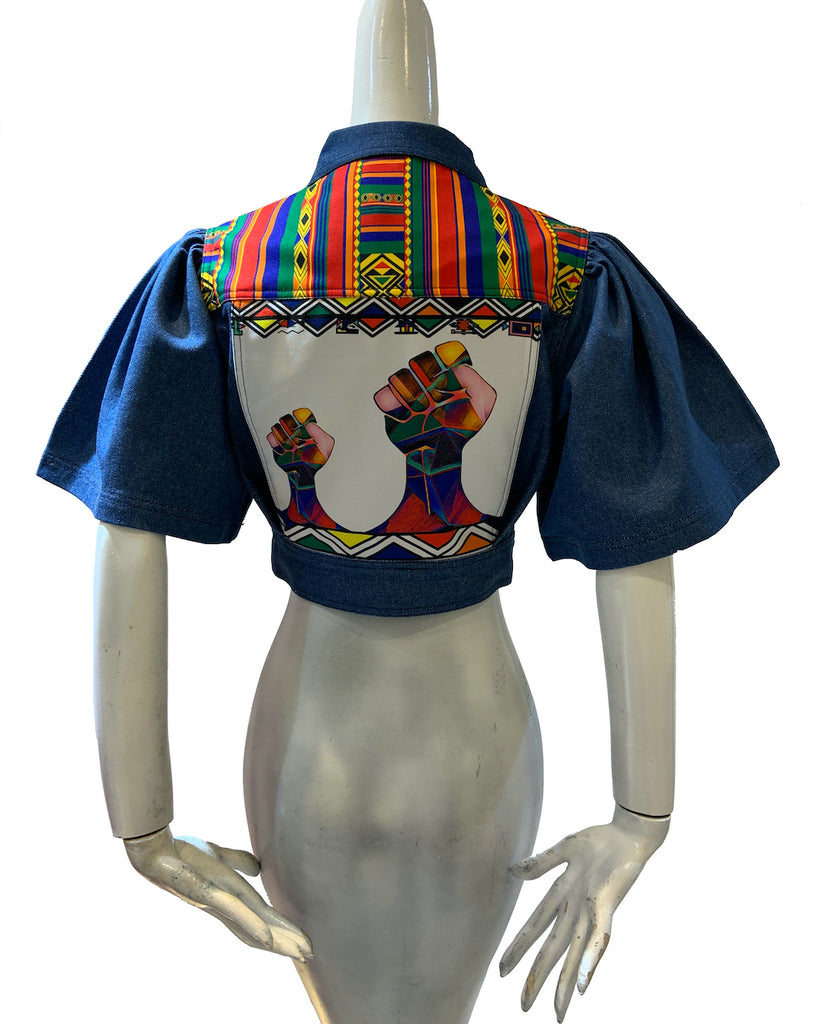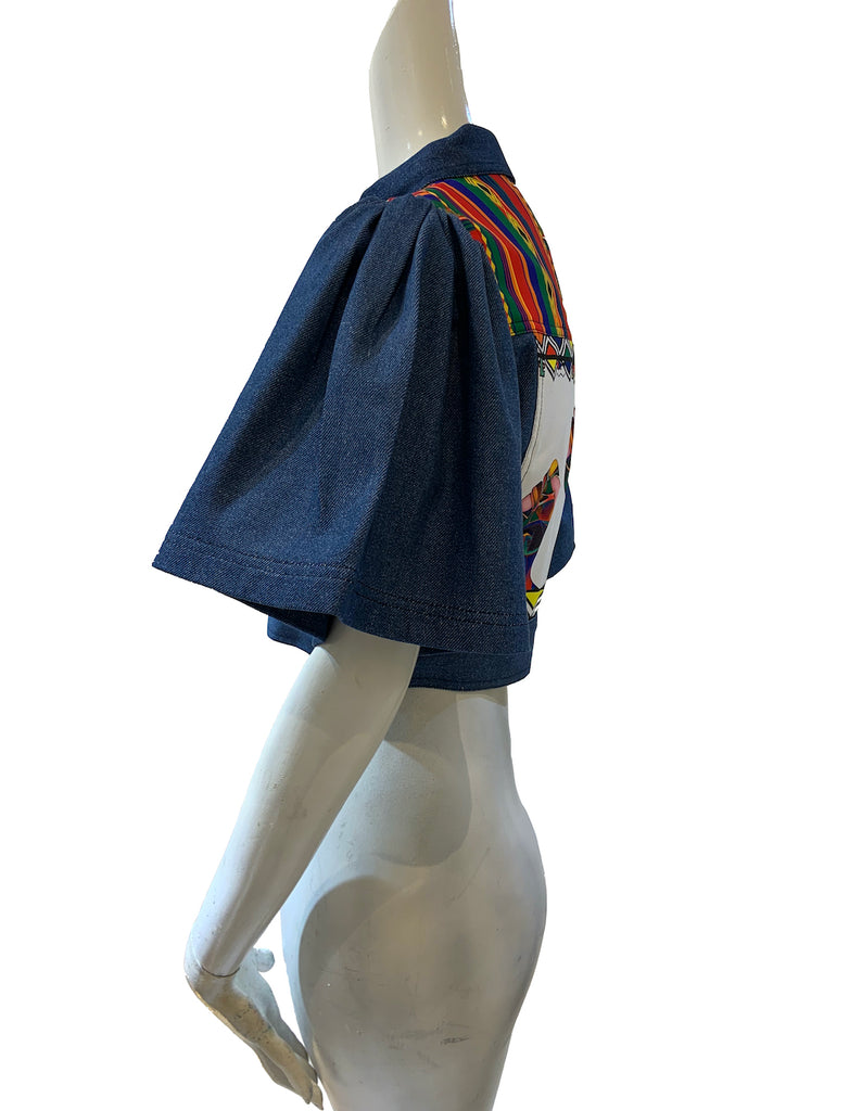 This denim jacket is combined with an original artwork of Mido & tribal patterns by Finchitua, The cropped jacket is wide & frilled short sleeved  -  with  front two pocket and button-up.