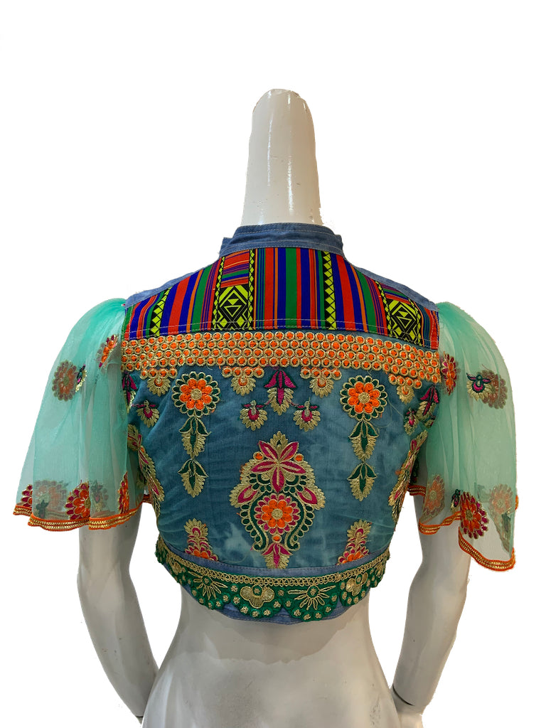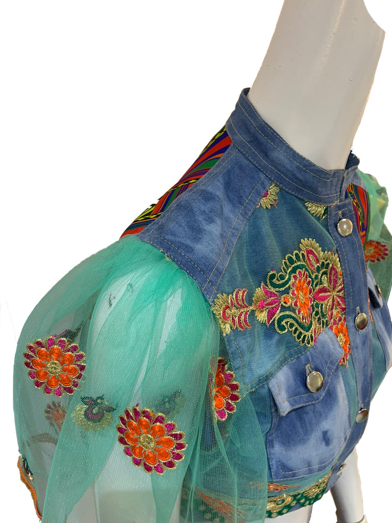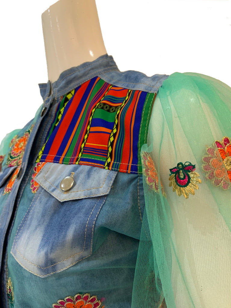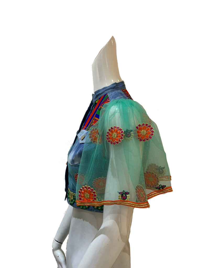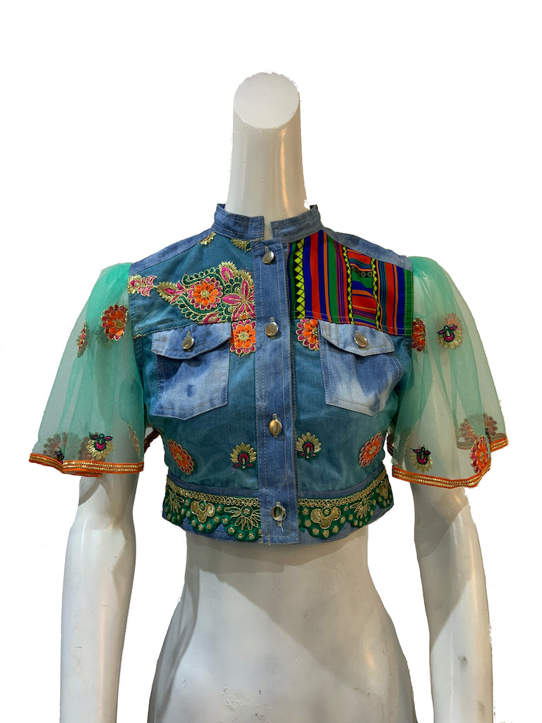 Finchitua Denim Jacket collection is one-off tailored with a luxury finish, Funky sophisticated off duty staples that speakers to the Brands tribal influences streetwear aesthetic. this blue cotton cropped denim jacket featuring a short sleeves, a collar style, two chest pockets, Multi fabrics, and a front button placket.