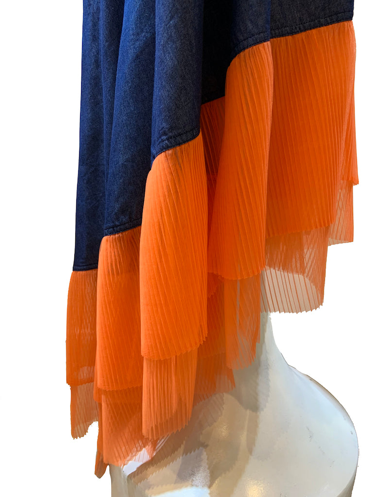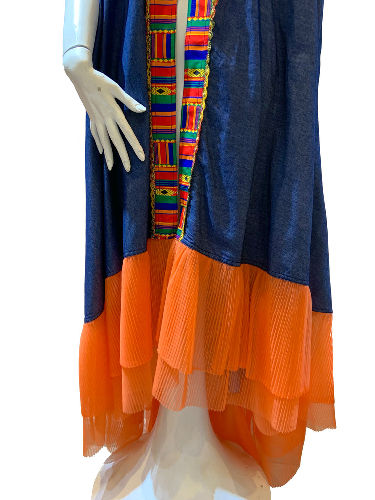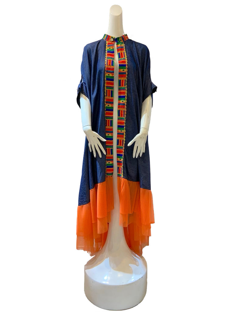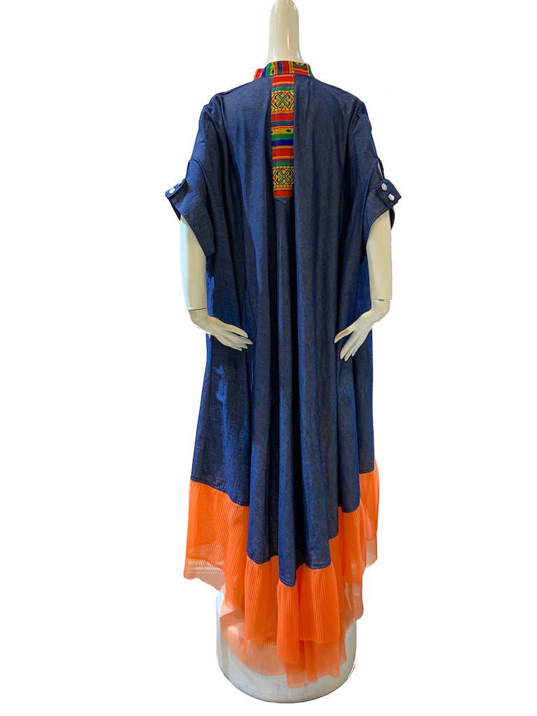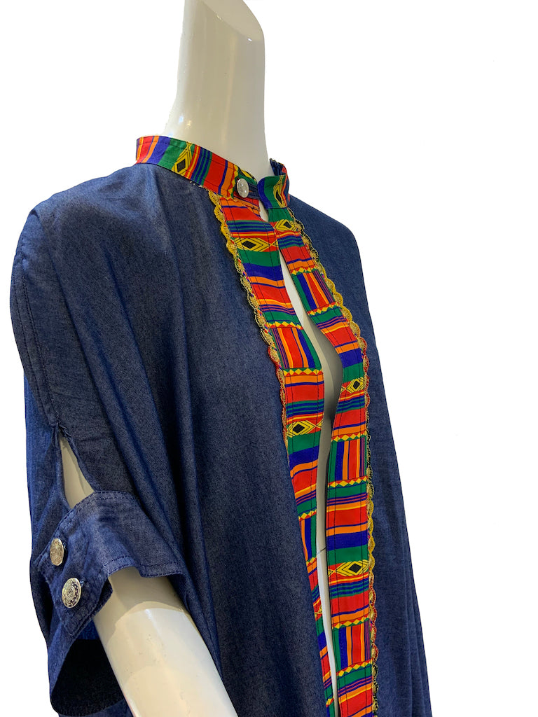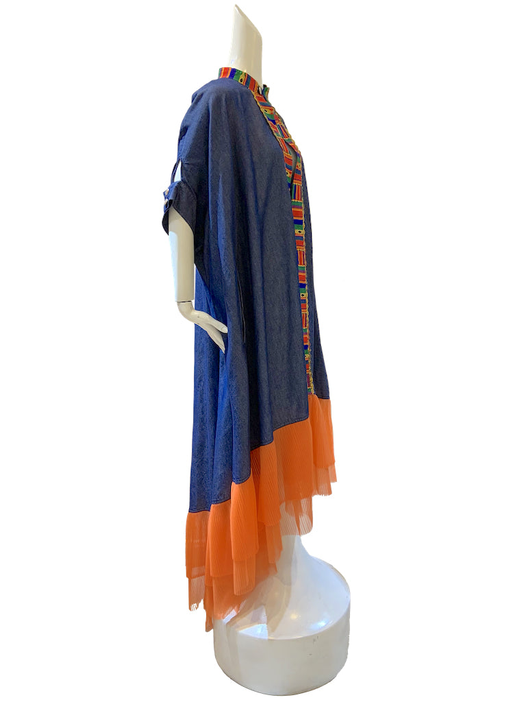 Kabba is an oversized denim cape with a wide A-line silhouette. Chinese collar, front pockets, high low hem with Finchitua pattern detailing and 3/4 sleeves.
