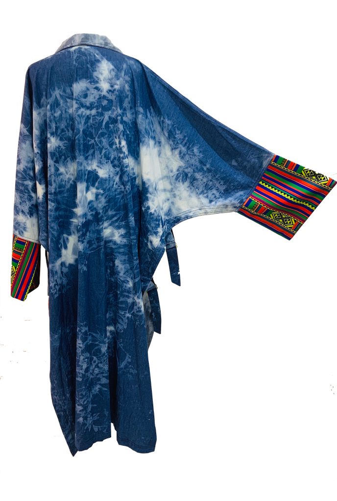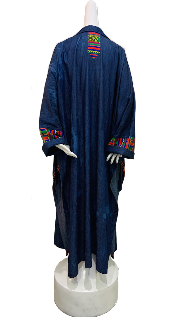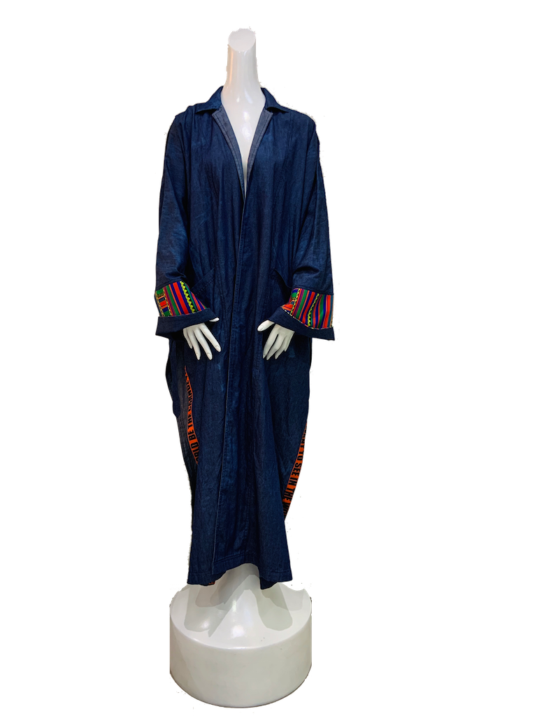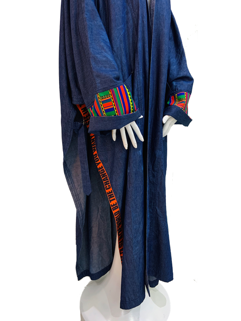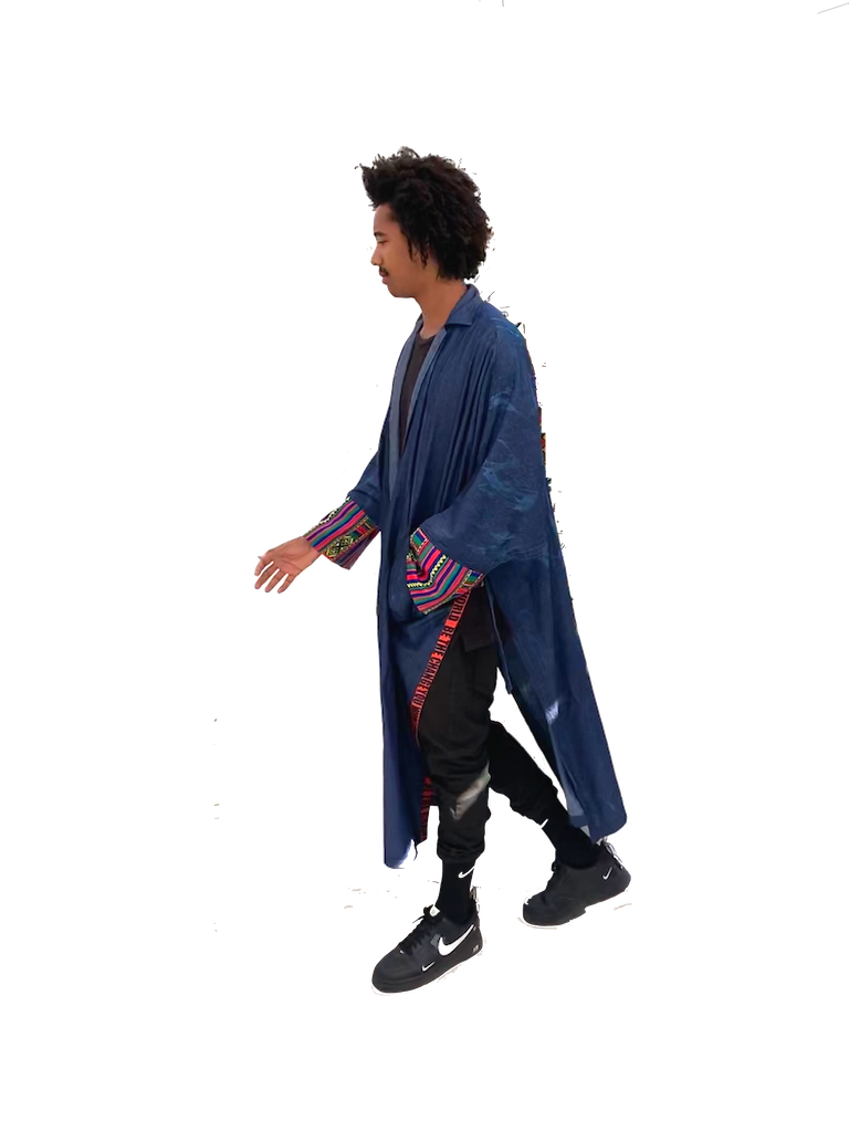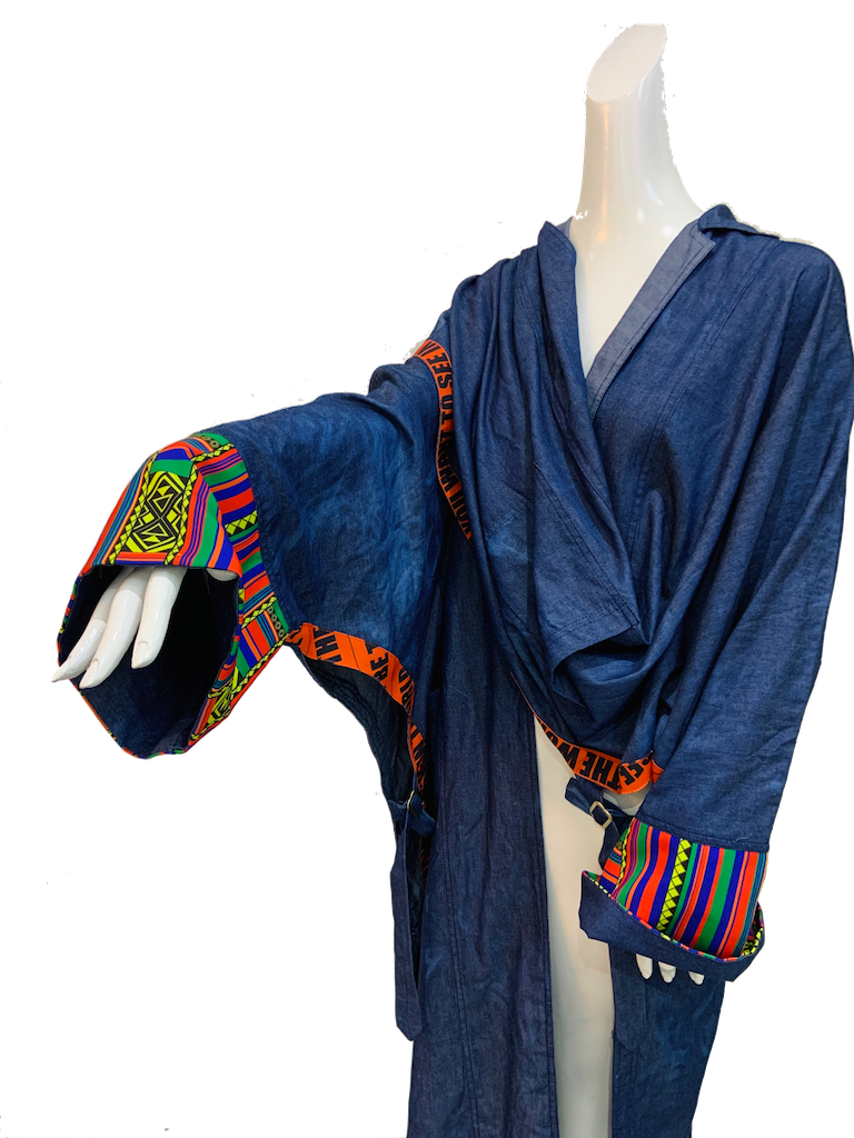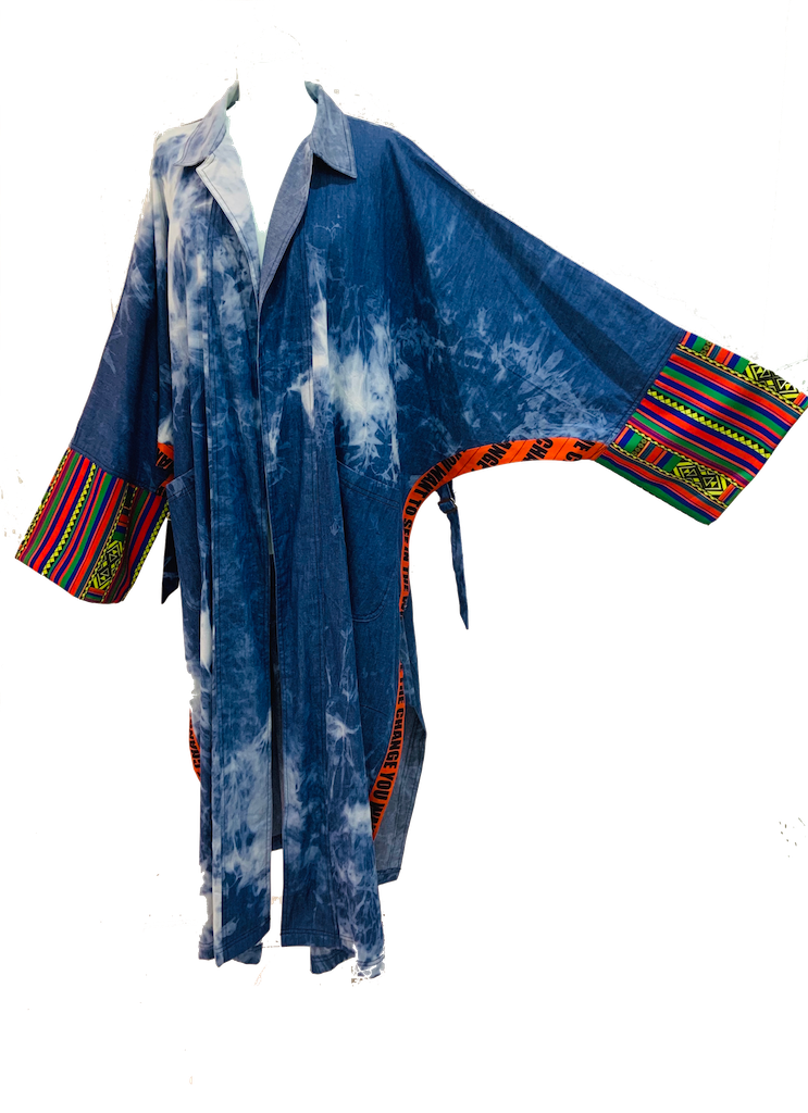 Finchitua combines elements from the Arab countries, Japan, and Africa in a single piece of clothing designed for the modern man/woman. Inspired by the flowing Kimono/Bisht, this men’s denim kimono features open front and side Patterns and quotes. The design of the Poncho Denim Kimono's side buckles and two front pockets add to its fun and casual look. Buy this Poncho online today to add to your unique collection.