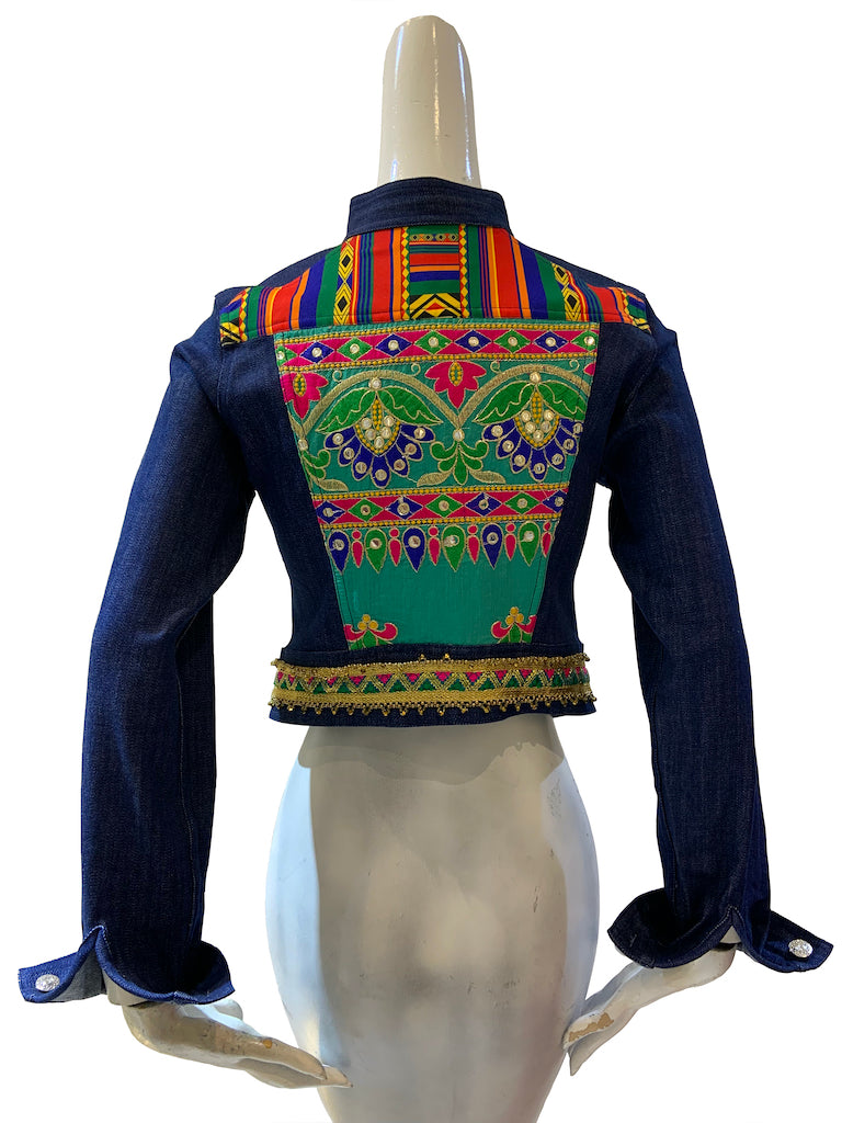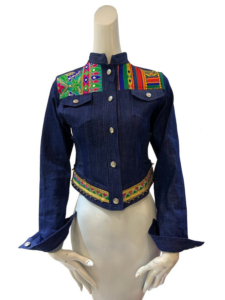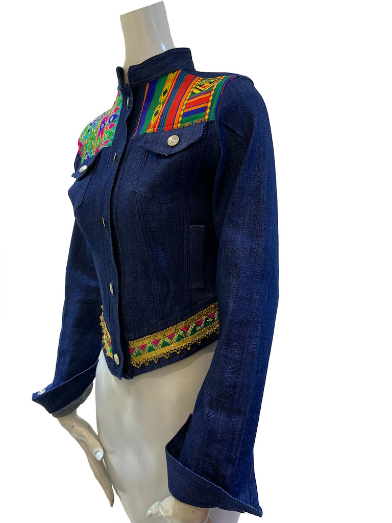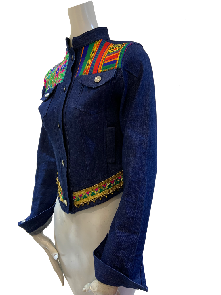 Finchitua Denim Jacket collection is one-off tailored with a luxury finish, Funky sophisticated off duty staples that speakers to the Brands tribal influences streetwear aesthetic. this blue cotton High to low hem denim jacket featuring long sleeves, Chinese collar style, two chest pockets, Multi fabrics, and a front button placket.