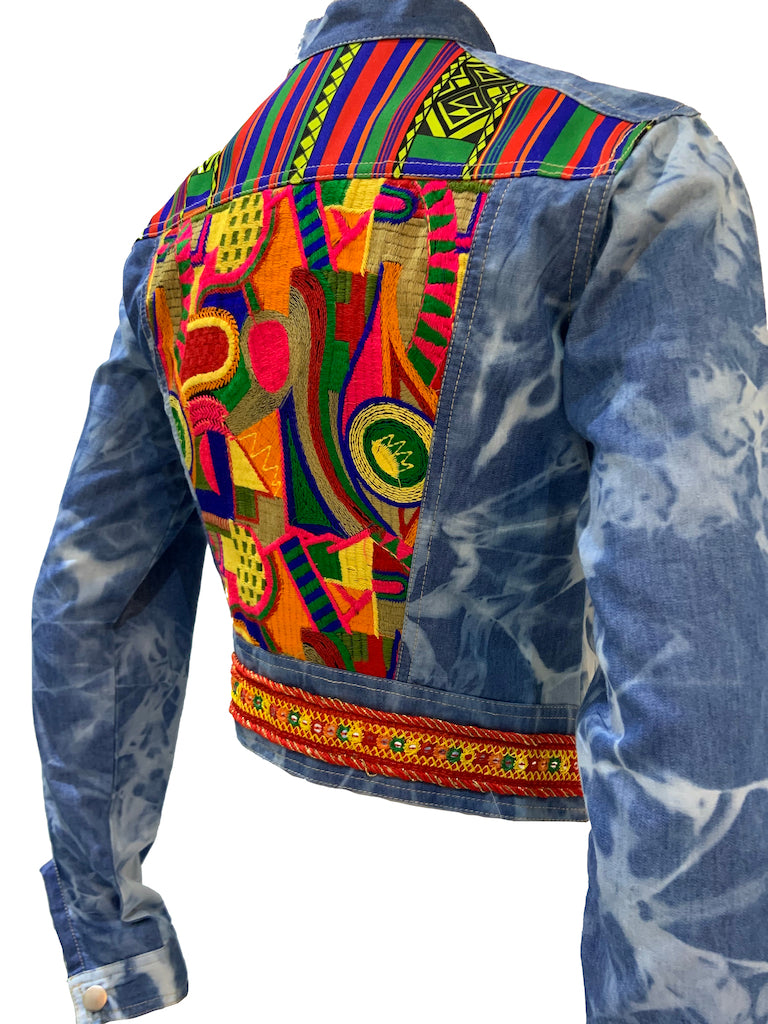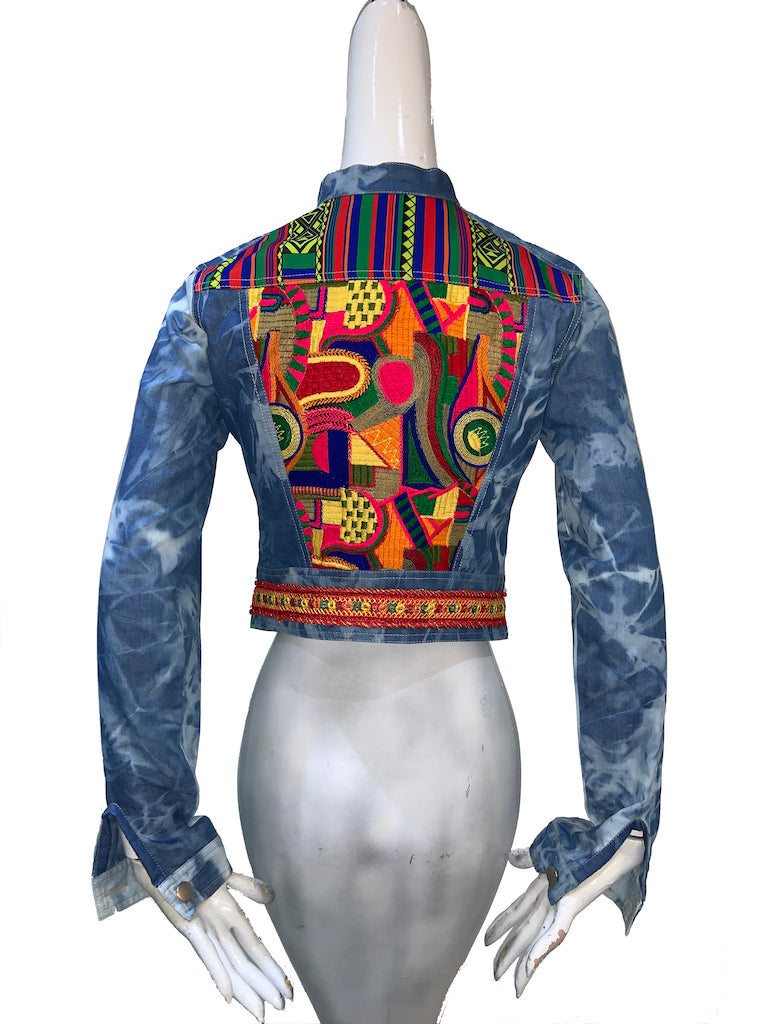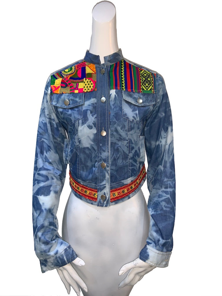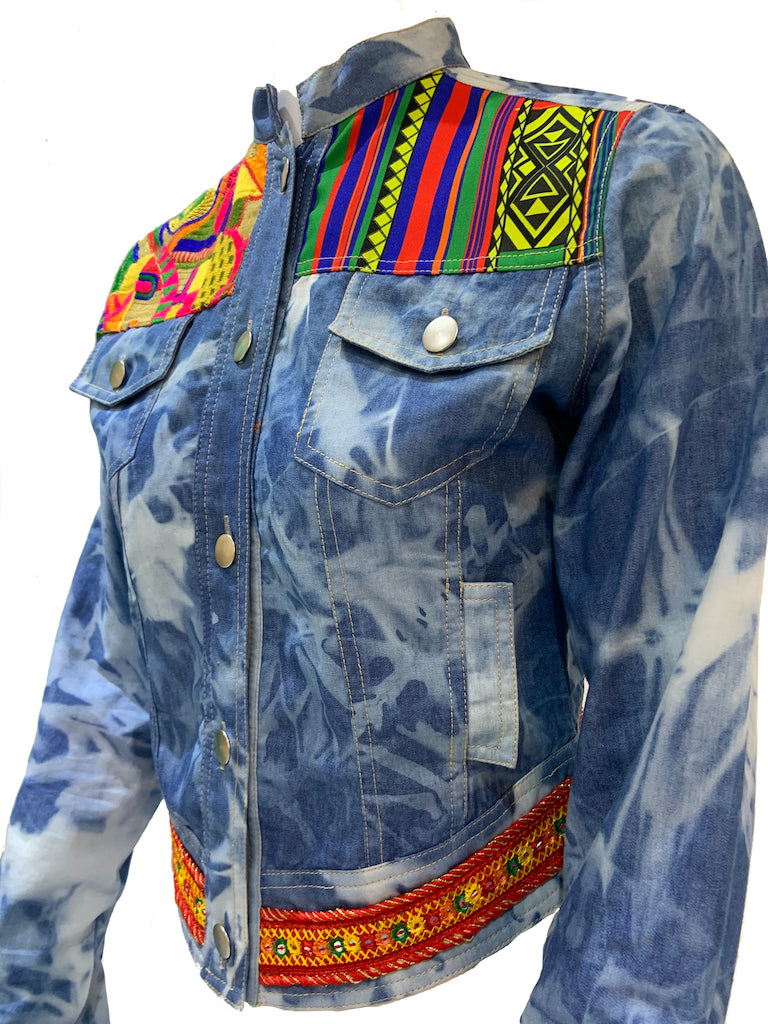 Finchitua Denim Jacket collection is one-off tailored with a luxury finish, Funky sophisticated off duty staples that speakers to the Brands tribal influences streetwear aesthetic. this blue cotton High to low hem denim jacket featuring long sleeves, Chinese collar style, two chest pockets, Multi fabrics, and a front button placket.
