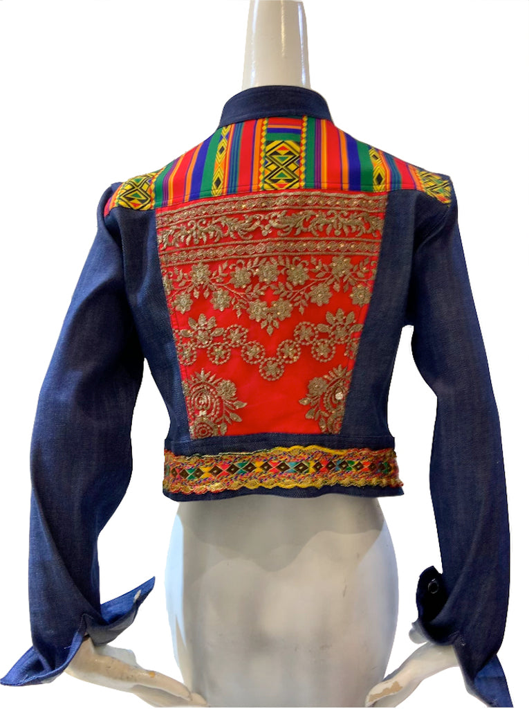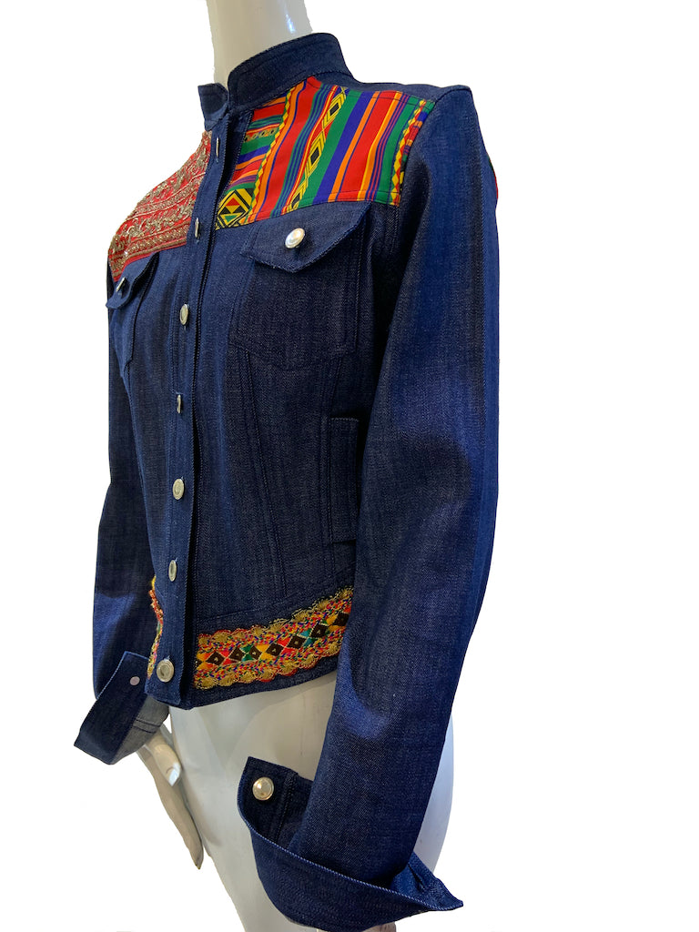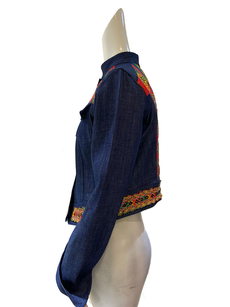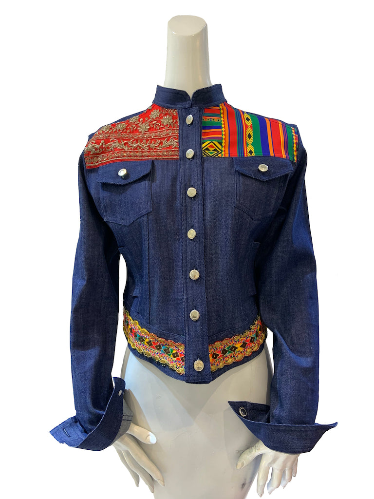 Finchitua Denim Jacket collection is one-off tailored with a luxury finish, Funky sophisticated off duty staples that speakers to the Brands tribal influences streetwear aesthetic. this blue cotton High to low hem denim jacket featuring long sleeves, a collar style, two chest pockets, Multi fabrics, and a front button placket.