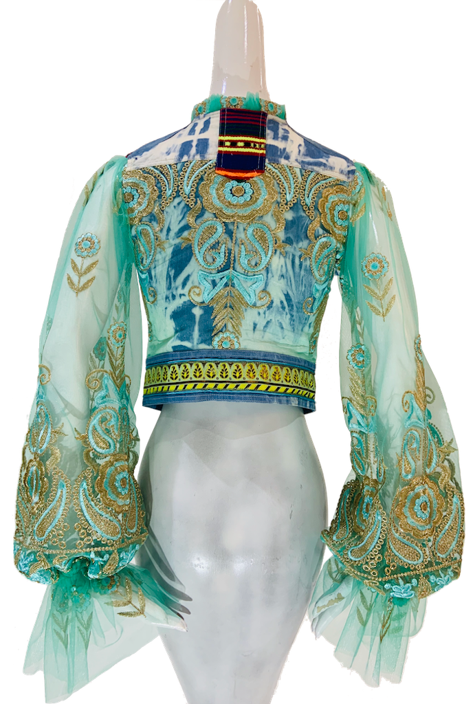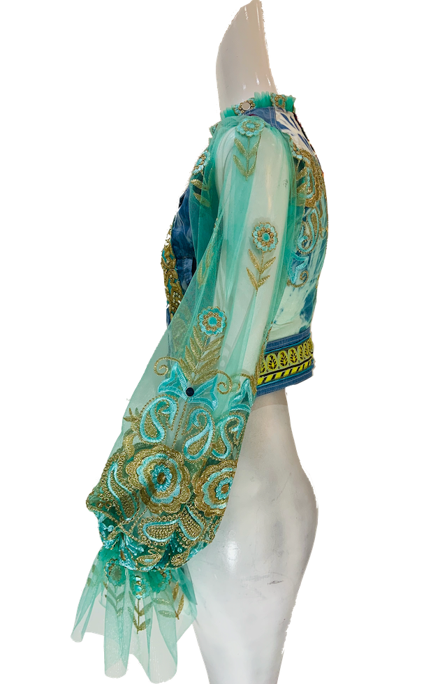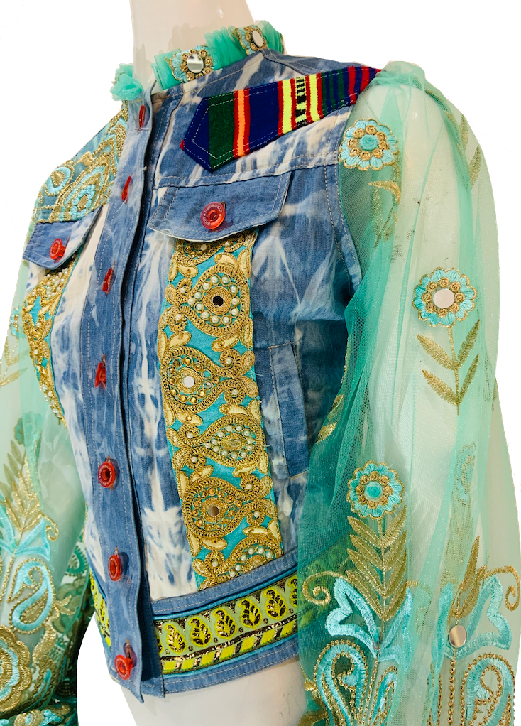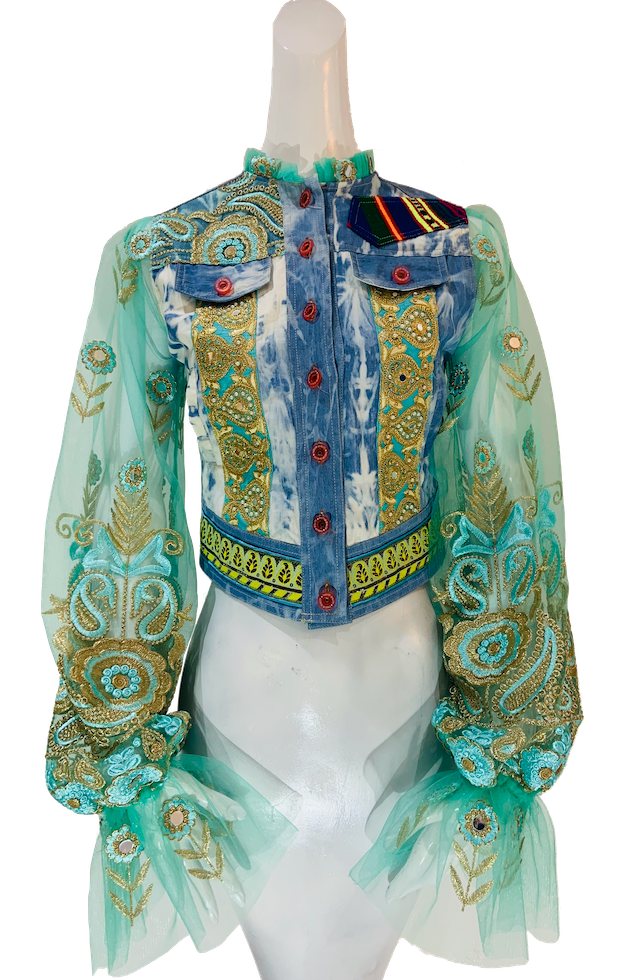 This unique jacket is made with denim and beaded/embroidered lace mixed with tribal patterns. The jacket is long-sleeved - and a front button.